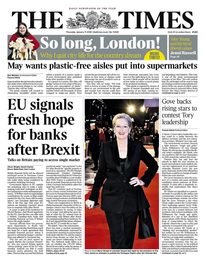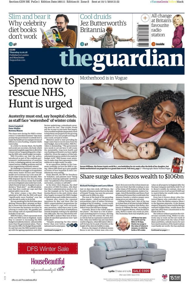 THE GUARDIAN – JUEVES 11/1/2018 – Instan al ministro de salud Michael Gove a que gaste cuanto antes en el rescate del servicio nacional de salud (NHS): altos cargos del ramo han dicho que la austeridad debe terminar, mientras el personal enfrenta el “punto de quiebere” de una crítica temporada invernal – Una subida en la cotización de sus acciones lleva a la fortuna de Jeff Bezos a alcanzar los US$ 106.000 millones – La maternidad, de moda: la antigua número 1 del tenis mundial Serena Williams luego de 6 meses de haber dado a luz a su pequeña hija, en foto del peruano Mario Testino.