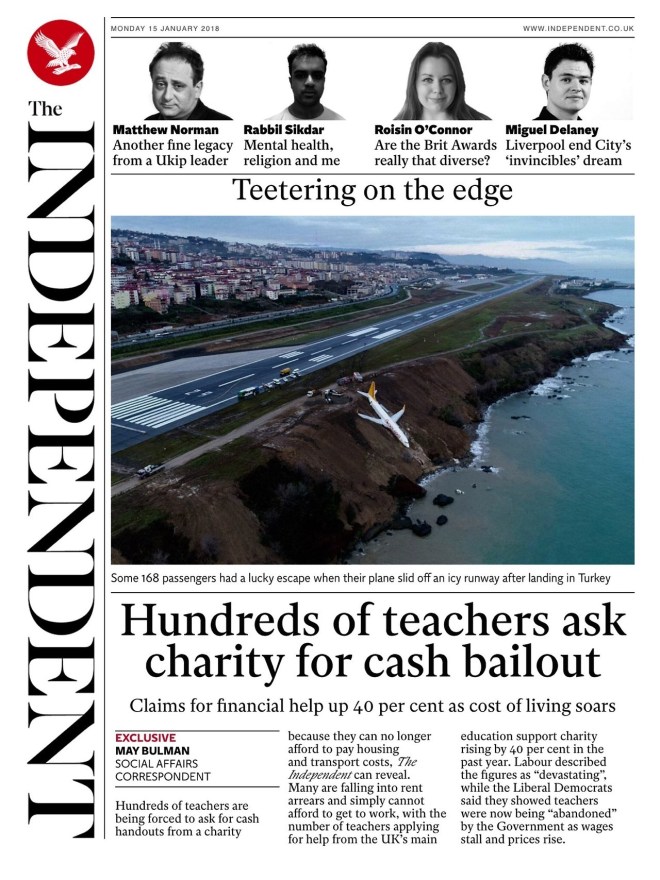 THE INDEPENDENT – LUNES 15/1/2018 – Cientos de profesores están siendo forzados a solicitar dinero en efectivo de una entidad de caridad porque no pueden afrontar gastos de alojamiento y transporte, según un informe del periódico. – Al borde del abismo: unos 168 pasajeros escaparon por poco de una tragedia, donde su avión resbaló de una pista de aterrizaje congelada en Trebisonda (Turquía)