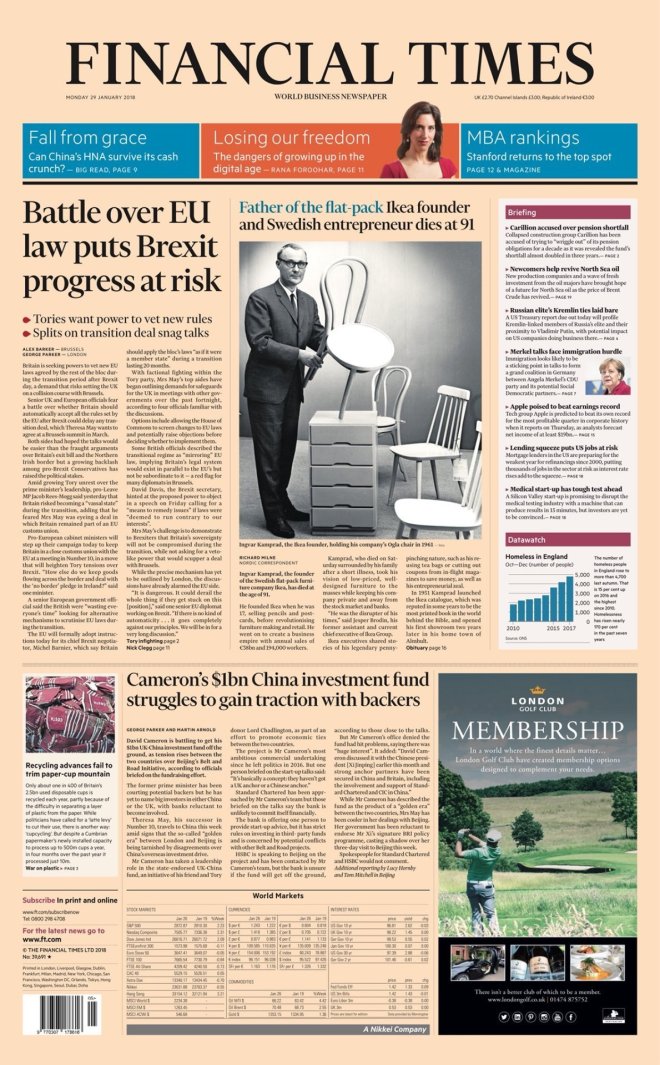 FINANCIAL TIMES – LUNES 28/1/2018 – Reino Unido está buscando facultades para revisar la legislación aprobada por la Unión Europea durante el período de transición del Brexit, una decisión que podría colocar al gobierno en colisión directa con Bruselas y por lo tanto demorar aún más las negociaciones – El fondo de inversiones de £1000 millones que el ex primer ministro británico David Cameron intenta formar con China sufre para despegar, al no encontrar inversores – Fallece el padre del empaque plano: foto de Ingvar Kamprad, fundador de IKEA, presentando su silla Ogla en 1961