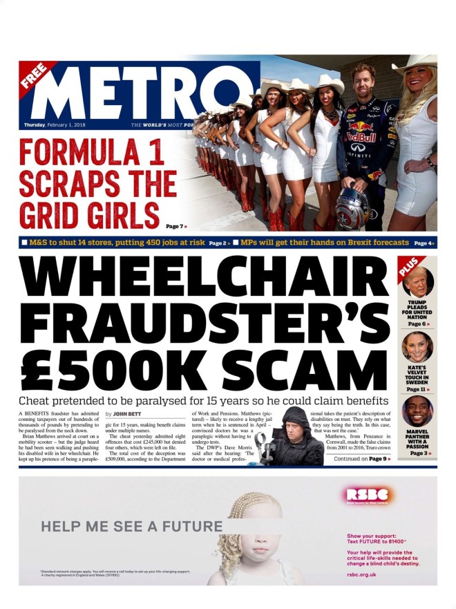 METRO – JUEVES ½/2018 – Un falso solicitante de beneficios ha admitido estafar más de £500.000 de los contribuyentes fingiendo estar paralítico por debajo del cuello: Brian Matthews llegó a la corte en una silla de ruedas motorizada, pero se dijo en la audiencia que había sido visto caminando y empujando la silla de su esposa, que sí está impedida físicamente – La Fórmula 1 prescinde de las chicas de la parrilla – M&S cerrará 14 tiendas, poniendo en riesgo 450 puestos de trabajo – El parlamento revisará las predicciones del Brexit