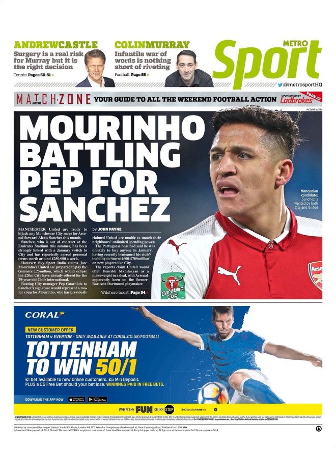 METRO SPORT – VIERNES 12/1/2018 – El Manchester United está preparado para contraofertar cualquier intención del Manchester City de hacerse con los servicios de Alexis Sánchez. El hasta hoy atacante del Arsenal