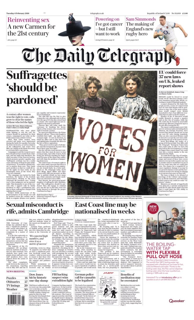 DAILY TELEGRAPH – MARTES 6/02/2018 – Las ‘sufragettes’, activistas que estuvieron dispuestas a infringir la ley para reinvindicar el derecho a voto de la mujer, “deben ser perdonadas por sus crímenes”; la solicitud se ha hecho a la secretaría del interior al cumplirse el centenario de ese logro – La Universidad de Cambridge ha admitido que tiene un “problema significativo” ante las más de 200 denuncias de inconductas sexuales que ha recibido en los últimos meses – La empresa ferroviaria East Coast puede ser nacionalizada en cuestión de semanas, por un cúmulo de fallos de las contratistas Stagecoach y Virgin – Foto colorizada de Annie Kenney y Christabel Pankhurst, responsables históricas del