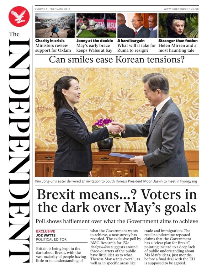 THE INDEPENDENT – DOMINGO 11/02/2018 – Brexit significa…? Reino Unido está a oscuras respecto del Brexit, y la vasta mayoría de personas tiene poco o ningún conocimiento de lo que el gobierno quiere lograr, según una nueva encuesta de BMG para The Independent; en ella se sugiere que 75% de la población tiene una vaga idea de lo que quiere lograr Theresa May en áreas específicas como comercio e inmigración. Los resultados echan por tierra los argumentos del gobierno, que dice que tiene “un plan claro para el Brexit” –