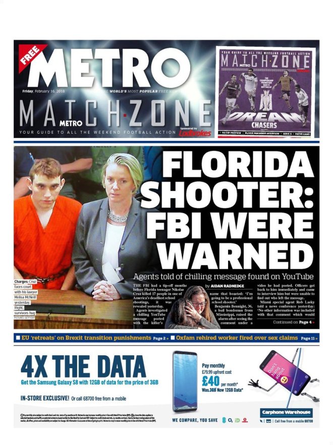 como fumar 20 cigarrillos al día durante el mismo tiempo – Más de 100 presentadores de BBC enfrentan cuentas de impuestos a pagar que pueden alcanzar cientos de miles de libras, luego de que la antigua estrella de la cadena Christa Ackroyd – quien ganaba más que la primera ministra – perdiese su caso contra la HMRC – Foto de una participante en la vigilia realizada en Parkland (Florida) por la masacre del miércoles en un instituto escolar a manos de un adolescente vinculado a grupos supremacistas blancos, con un saldo de 17 muertos de los cuales 14 eran estudiantes. Se han reabierto divisiones políticas al negarse el presidente Trump a referirse al control de armas en su mensaje televisado, motivando a sobrevivientes, congresistas y al expresidente Barack Obama a pedir la modificación de la norma
