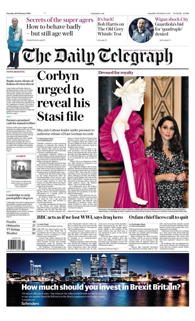 DAILY TELEGRAPH – MARTES 20/02/2018 – Jeremy Corbyn enfrenta una creciente presión para autorizar la publicación de los archivos de la época de la Guerra Fría que la Stasi (servicio secreto de la ex Alemania del Este) mantenía sobre él, luego de que Theresa May dijera que el político laborista debe ser “abierto y transparente” sobre sus lazos con antiguos espías comunistas – La BBC ha permitido que el dolor por los horrores de la I Guerra Mundial oculte el hecho de que fue una gran victoria militar, según el héroe de la campaña de Irak, coronel Tim Collins – Mark Goldring, presidente de la oenegé Oxfam, enfrenta hoy un pedido de dimisión por parte del Parlamento – Los bancos alertan a sus clientes del riesgo que suponen las elecciones italianas, programadas para principios de marzo – Foto de la duquesa de Cambridge, observando un vestido fabricado por la diseñadora Stella McCartney en colaboración con la firma textil hindú Oshadi, en una recepción en el palacio de Buckingham