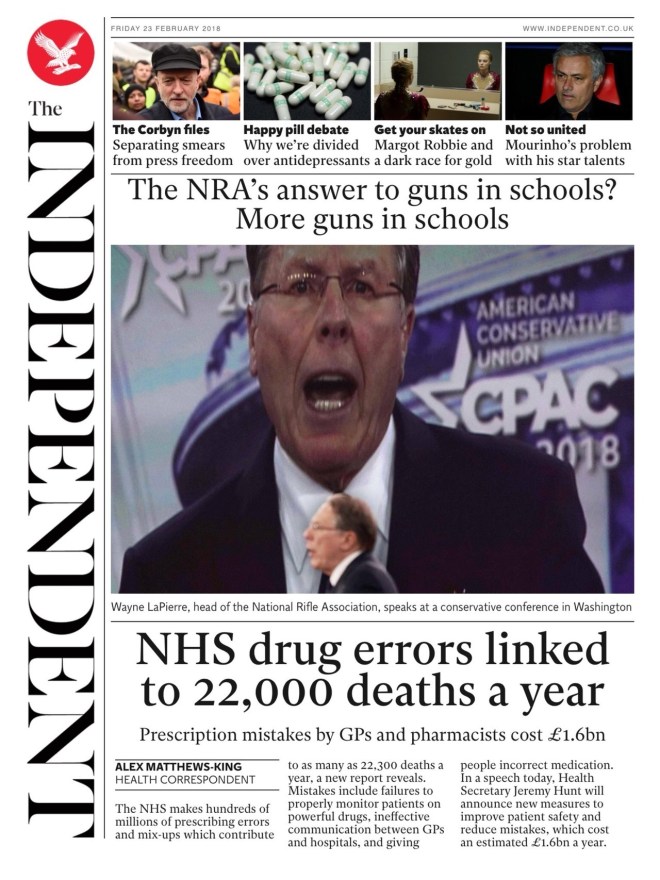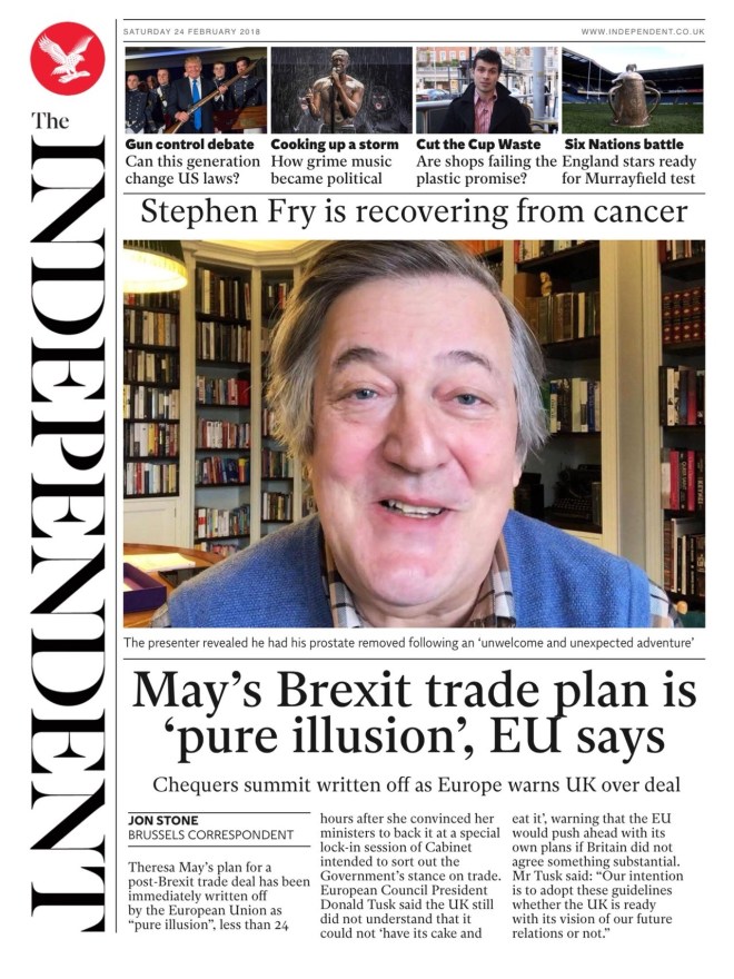 THE INDEPENDENT – SÁBADO 24/02/2018 – El plan de Theresa May para un acuerdo comercial después de la salida británica de Europa ha sido descartado inmediatamente por la Unión Europea y catalogado como “pura ilusión”, menos de 24 horas después de que May comvenciera a sus ministros de respaldarlo en una sesión especial de su gabinete – El actor y presentador Stephen Fry ha revelado que se recupera de una extirpación de un cáncer de páncreas