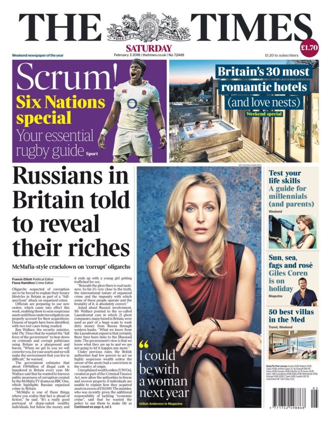 THE TIMES – SÁBADO 3/02/2018 – Los oligarcas rusos sospechosos de corrupción serán forzados a explicar sus lujosos estilos de vida en Reino Unido como parte de un ataque al crimen organizado en todos sus aspectos. Las entidades oficiales se preparan a emplear nuevas órdenes, implementadas esta semana, autorizándolas a intervenir activos sospechosos hasta que los investigados puedan efectivamente demostrar sus adquisiciones – “Podría estar con una mujer el próximo ano” – Gillian Anderson, actriz conocida por su papel de la teniente Scully en “Los expedientes X”