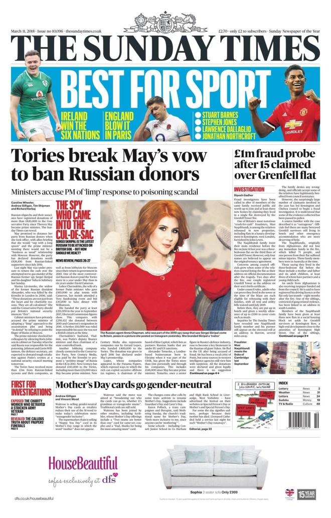 Oligarcas rusos y sus socios han registrado donaciones de más de £820.000 al Partido Conservador desde que Theresa May es primera ministra. A pesar de que May prometió distanciar al partido de donantes rusos cuando asumió el cargo, el partido ha declarado donaciones por £826.100 de simpatizantes con vinculaciones rusas desde julio de 2016. Anoche May recibía presiones para devolver el montante por el intento de asesinato con gas nervioso del ex espía ruso Sergei Skripal y su hija Yulia en Salisbury el domingo pasado. Marina, la viuda del disidente ruso Alexander Litvinenko – asesinado por el Kremlin en 2006 – ha dicho que “aquellas donaciones no han sido hechas con el corazón ni por razones caritativas. Todas han sido calculadas.” Agregó que el Partido Conservador debería poner “primero” los intereses de seguridad nacional de Reino Unido