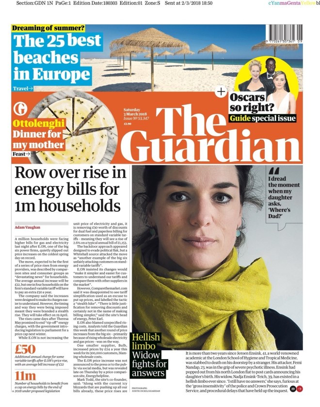 THE GUARDIAN – SÁBADO 03/03/2018 – Un millón de hogares enfrentan facturas más altas de gas y electricidad desde anoche: E.ON, una de las seis mayores firmas de energía, silenciosamente ha deslizado los aumentos de precios en el día