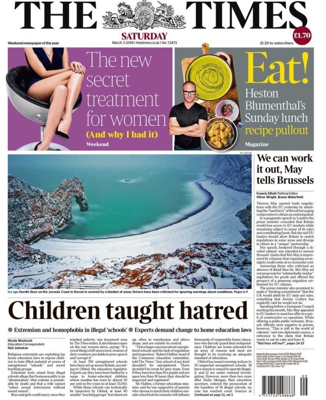 THE TIMES – SÁBADO 03/03/2018 – Enseñan odio a los niños: extremistas religiosos aprovechan la permisiva legislación e imparten clases de extremismo y homofobia en “escuelas” ilegales, mientras expertos demandan cambios en la legislación de la educación doméstica – Theresa May inició ayer negociaciones comerciales con la UE al admitir los “hechos reales” de Brexit, pero instó a un compromiso para garantizar un acuerdo “duradero”: en un discurso pragmático en Londres, la primera ministra admitió que Gran Bretaña perdería el acceso a los mercados de la UE y tendría que seguir obedeciendo a muchas de sus reglas – Foto de Durdle Door, en Jurassic Coast (Dorset), cubierta de un grueso manto de nieve