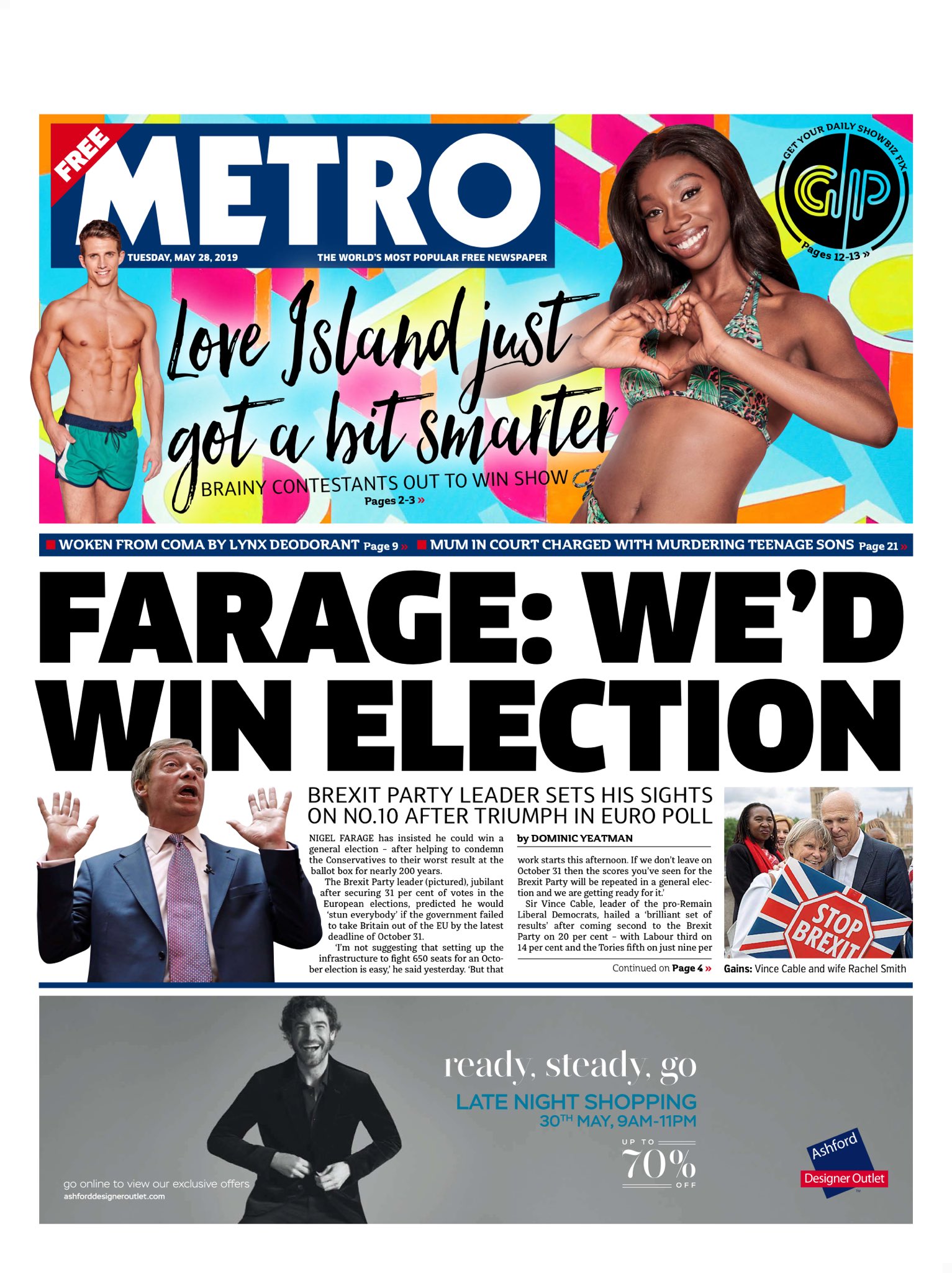 Hablando después de ser reelegido para el Parlamento Europeo, Farage agregó: «Si no abandonamos la Unión Europea el 31 de octubre, las cifras que hemos visto para el Partido del Brexit hoy se repetirán en una elección general.»
