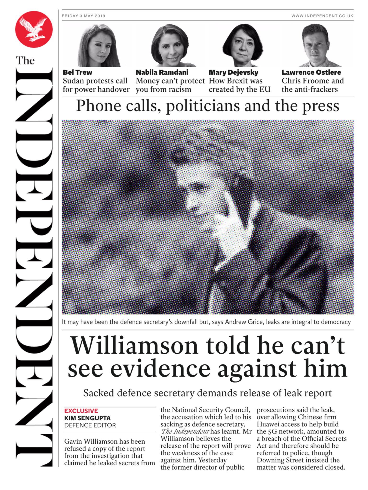 [Llamadas telefónicas, políticos y libertad de prensa: podrá haber significado la destitución del ministro de defensa Gavin Williamson (foto), pero para el columnista político Andrew Grice las filtraciones son necesarias para la democracia.]