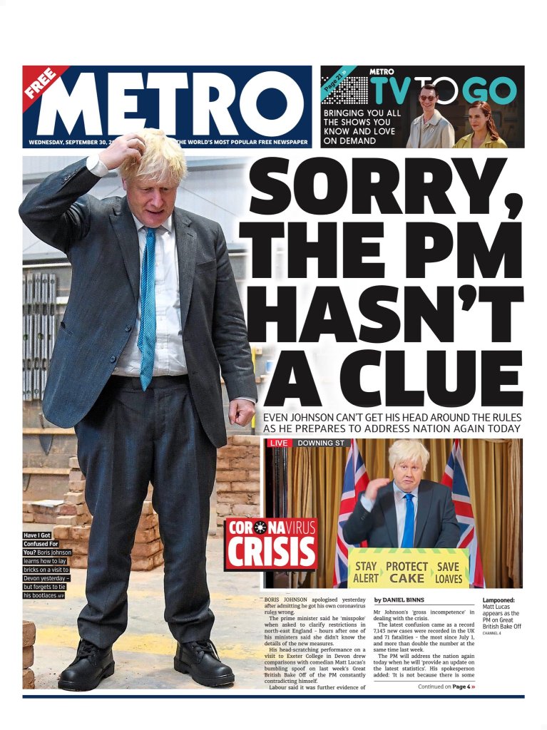 En un calamitoso dรญa para el Gobierno, Johnson dijo en una conferencia de prensa televisada que los ciudadanos del noreste podrรญan reunirse en pubs si obedecรญan la Regla de 6, a pesar de que una nueva ley a principios de esta semana prohรญbe a los hogares mezclarse bajo techo en la regiรณn.
