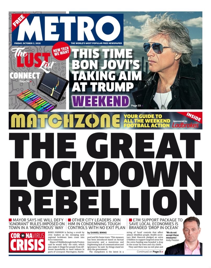 El alcalde de Middlesbrough, Andy Preston, dijo que Ā«desafiarĆaĀ» las reglas, segĆŗn las cuales es ilegal que personas de diferentes hogares se reĆŗnan en lugares cerrados en partes de Liverpool, Warrington, Hartlepool y su ciudad natal. Ā«Esta medida se ha introducido sobre la base de inexactitudes fĆ”cticas y una monstruosa y aterradora falta de comunicación e ignorancia,Ā» dijo. Ā«Tal como estĆ”n las cosas, desafiamos al Gobierno.Ā»