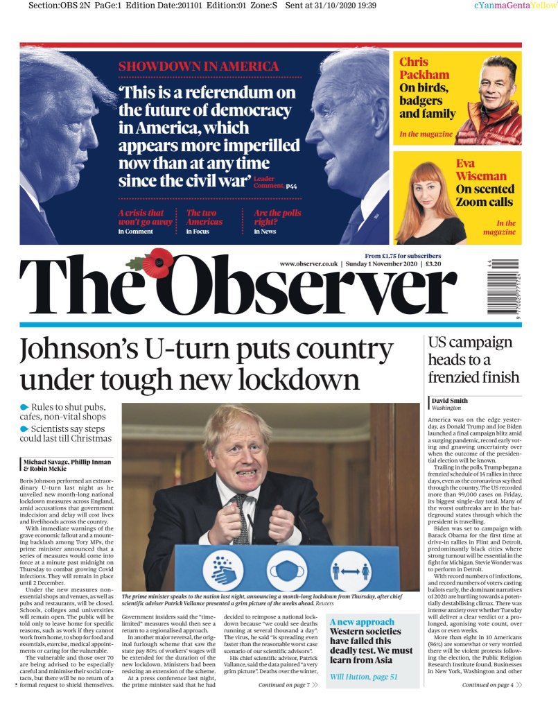 En rueda de prensa, el primer ministro británico manifestó que había decidido volver a imponer un confinamiento nacional porque “podíamos ver que se avecinaban muertes de varios miles por día”. El virus, dijo, «se está propagando incluso más rápido que el peor de los casos razonables de nuestros asesores científicos», y añadió: «El riesgo es que, por primera vez en nuestras vidas, el NHS no hubiera podido estar allí para ayudarnos a nosotros y a nuestras familias.»