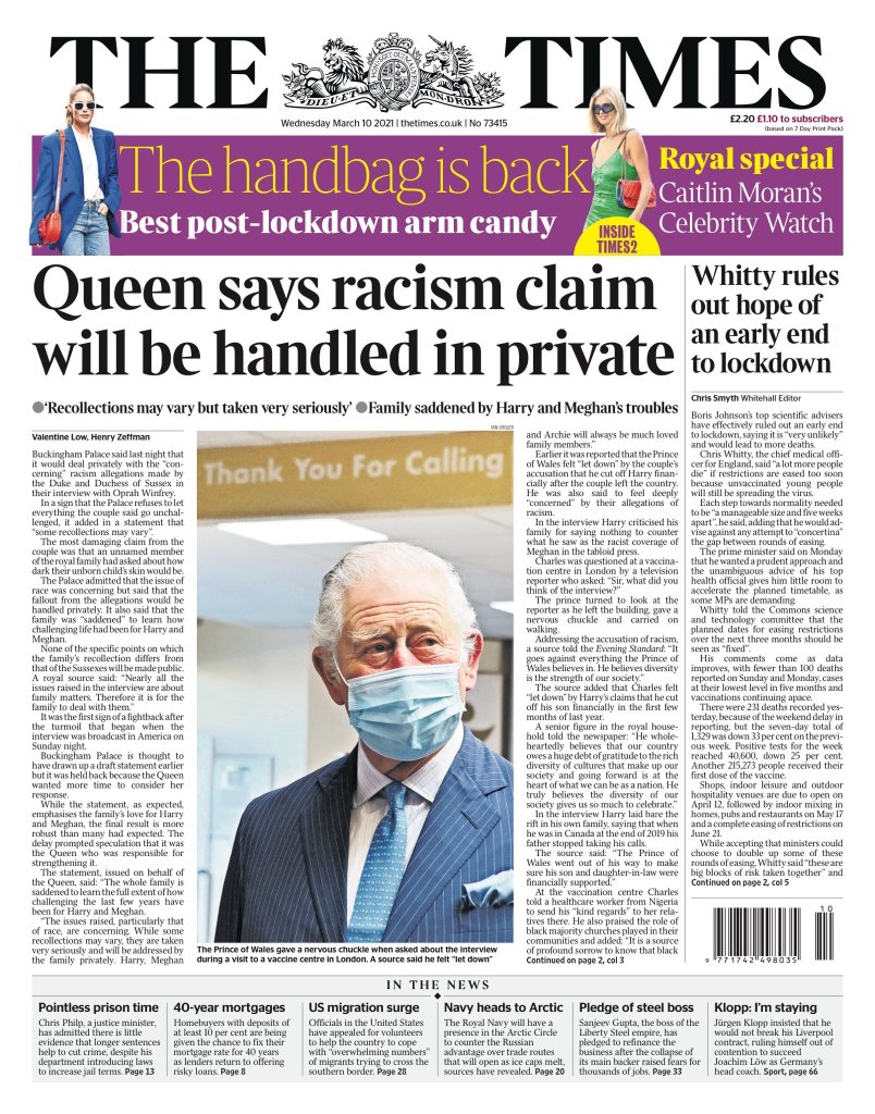 Un rteportero de televisión preguntó a Carlos — el primer miembro de la realeza que ha aparecido en un compromiso público en persona desde que Harry y Meghan hicieran sus incendiarios reclamos — en un centro de vacunación en Londres: «¿Qué piensa de la entrevista?» A su salida del edificio, el príncipe se volvió para mirar al reportero, esbozó una risa nerviosa y siguió caminando.