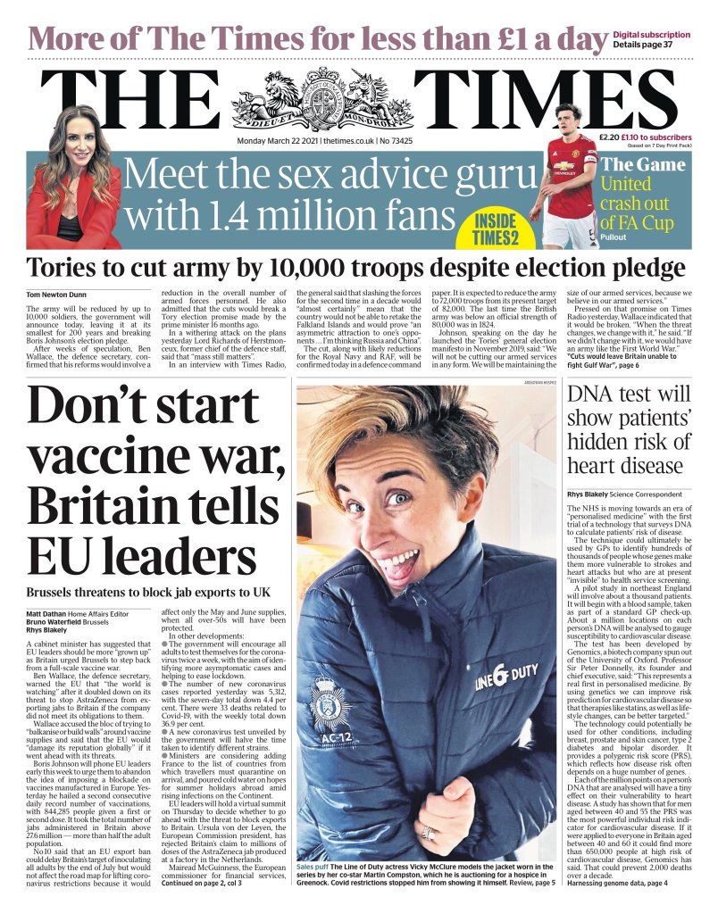 Ursula von der Leyen, presidenta de la Comisión Europea, afirma que es posible que se necesiten controles de exportación para obligar a AstraZeneca a cumplir con sus obligaciones con la UE. Su portavoz dijo: «No se trata de prohibir las exportaciones de vacunas, se trata de asegurarse de que las empresas cumplan con sus compromisos con los estados miembros y la Unión Europea, como constan en los contratos que tienen con nosotros.»