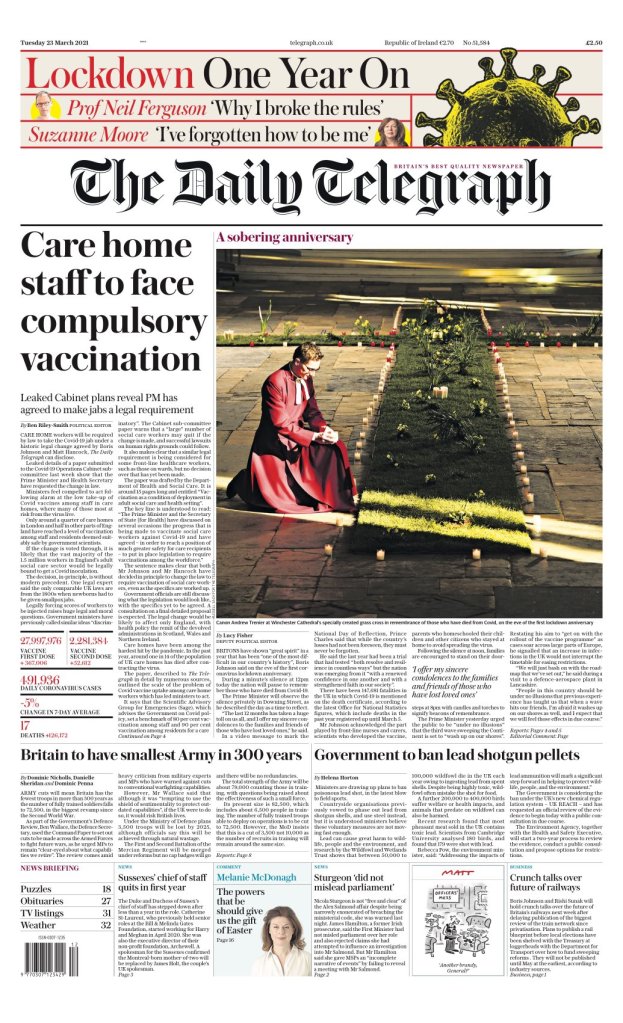 Se entiende que su línea principal dice: «El Primer Ministro y el ministro de estado [Hancock] han discutido en varias ocasiones los avances que se están logrando para vacunar a trabajadores asistenciales contra el Covid-19 y han acordado, para alcanzar un posición de mucha mayor seguridad para los beneficiarios de la atención: implementar una legislación que requiera vacunas entre la fuerza laboral.»