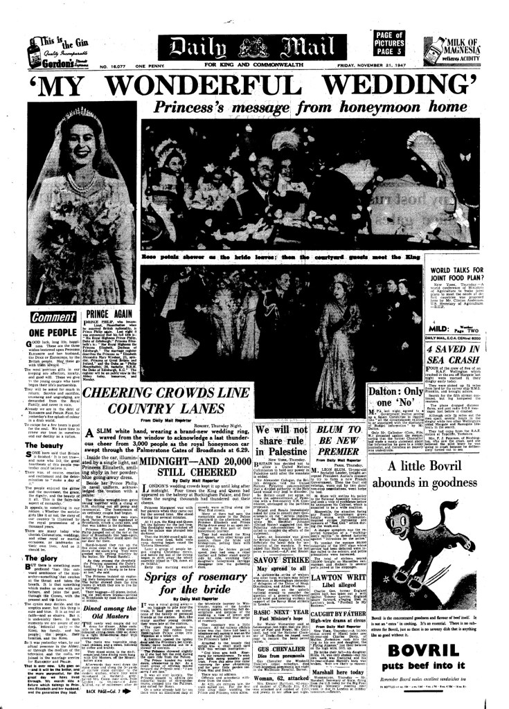 Portada histórica del día siguiente a la boda de la entonces Princesa Isabel con Philip Mountbatten, en ceremonia realizada en la Abadía de Westminster grabada y transmitida por BBC Radio a 200 millones de personas en todo el mundo