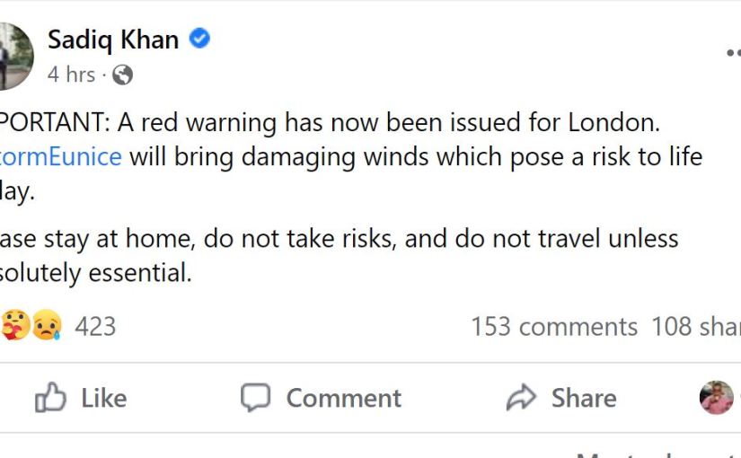El alcalde de Londres ha instado a la gente a ‘quedarse en casa’ y ‘no correr riesgos’ mientras la tormenta Eunice azota la capital.