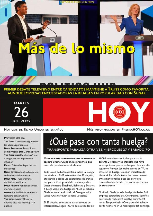 Primer debate televisivo entre candidatos mantiene a Truss como favorita, aunque empresas encuestadoras la igualan en popularidad con Sunak