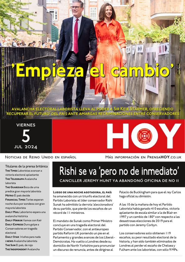 El mandato de Sunak como Primer Ministro concluye en una tragedia electoral del Partido Conservador, con el antieuropeo partido Reform UK poniendo un pie en el Parlamento y grandes avances de los Liberal-Demócratas. Ha vuelto a Londres desde su domicilio de North Yorkshire para pronunciar un discurso de renuncia, antes de dirigirse al Palacio de Buckingham para que el rey Carlos haga oficial su dimisión.