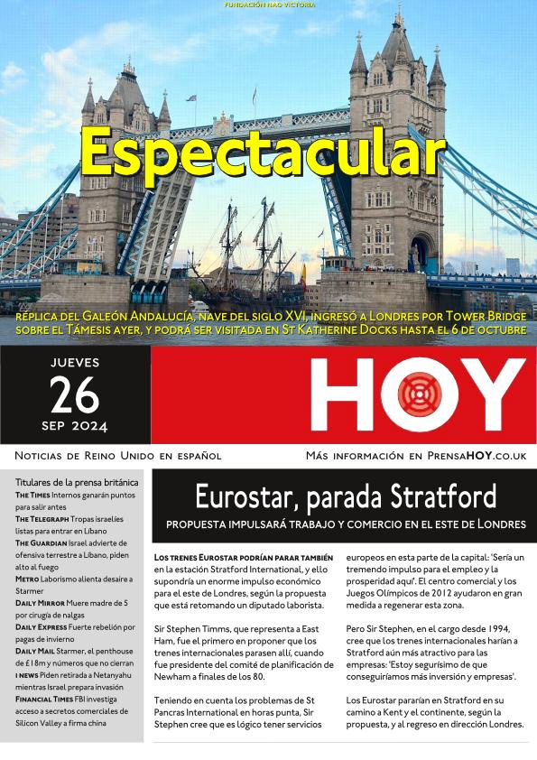 Réplica del Galeón Andalucía, nave del siglo XVI, ingresó a Londres por Tower Bridge sobre el Támesis ayer, y podrá ser visitada en St Katherine Docks hasta el 6 de octubre