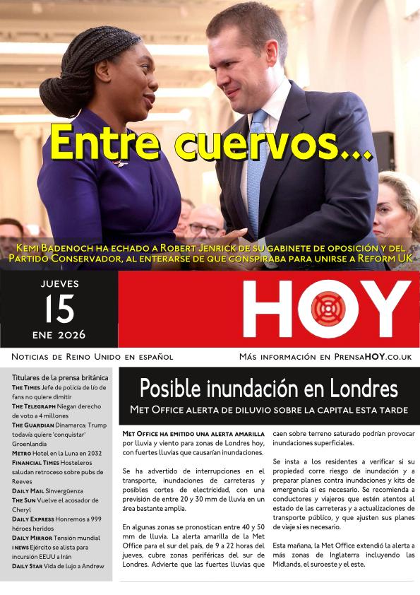 En algunas zonas se pronostican entre 40 y 50 mm de lluvia. La alerta amarilla de la Met Office para el sur del país, de 9 a 22 horas del jueves, cubre zonas periféricas del sur de Londres. Advierte que las fuertes lluvias que caen sobre terreno saturado podrían provocar inundaciones superficiales.