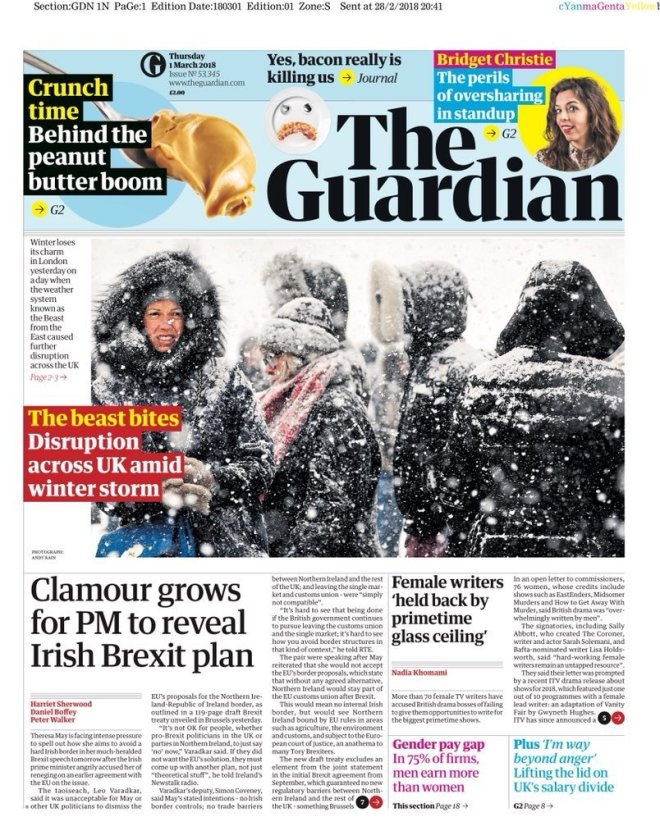 sobre el Brexit, en medio de fricciones sobre la frontera irlandesa; el primer ministro irlandés Leo Varadkar ha acusado airadamente a su similar británica de incumplir su anterior acuerdo con la UE sobre el tema – El pensamiento obsoleto “sigue reteniendo la progresión de las escritoras de televisión”: una carta firmada por 70 guionistas argumenta que el trabajo dramático de prestigio continúa siendo mayoritariamente masculino – El auge de las leguminosas, o cómo nos volvimos locos por la mantequilla de maní de gala: la confiable pasta de untar está experimentando un gran impulso en popularidad a medida que las versiones artesanales preferidas por fanáticos del gimnasio y consumidores saludables por igual impulsan las ventas – La bestia muerde: foto de gente arropándose contra el frío durante las fuertes nevadas de ayer en Londres y todo Reino Unido