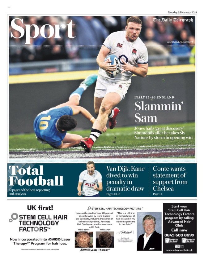 TELEGRAPH SPORT – LUNES 5/02/2018 – Inglaterra ha defendido su título venciendo a Italia en el Stadio Olimpico de Roma (15-46) en un impecable partido con siete tries, iniciado con dos tries del ala Anthony Watson y donde el back row Sam Simmonds (foto) ha encabezado la apisonadora inglesa sobre los locales – El defensa del Liverpool Virgil Van Dijk ha dicho que Harry Kane, estrella del Tottenham Hotspur, ha fingido la caída en el area por la que los Spurs han conseguido empatar el partido 2-2 – Antonio Conte quiere una declaración de apoyo por parte del Chelsea FC