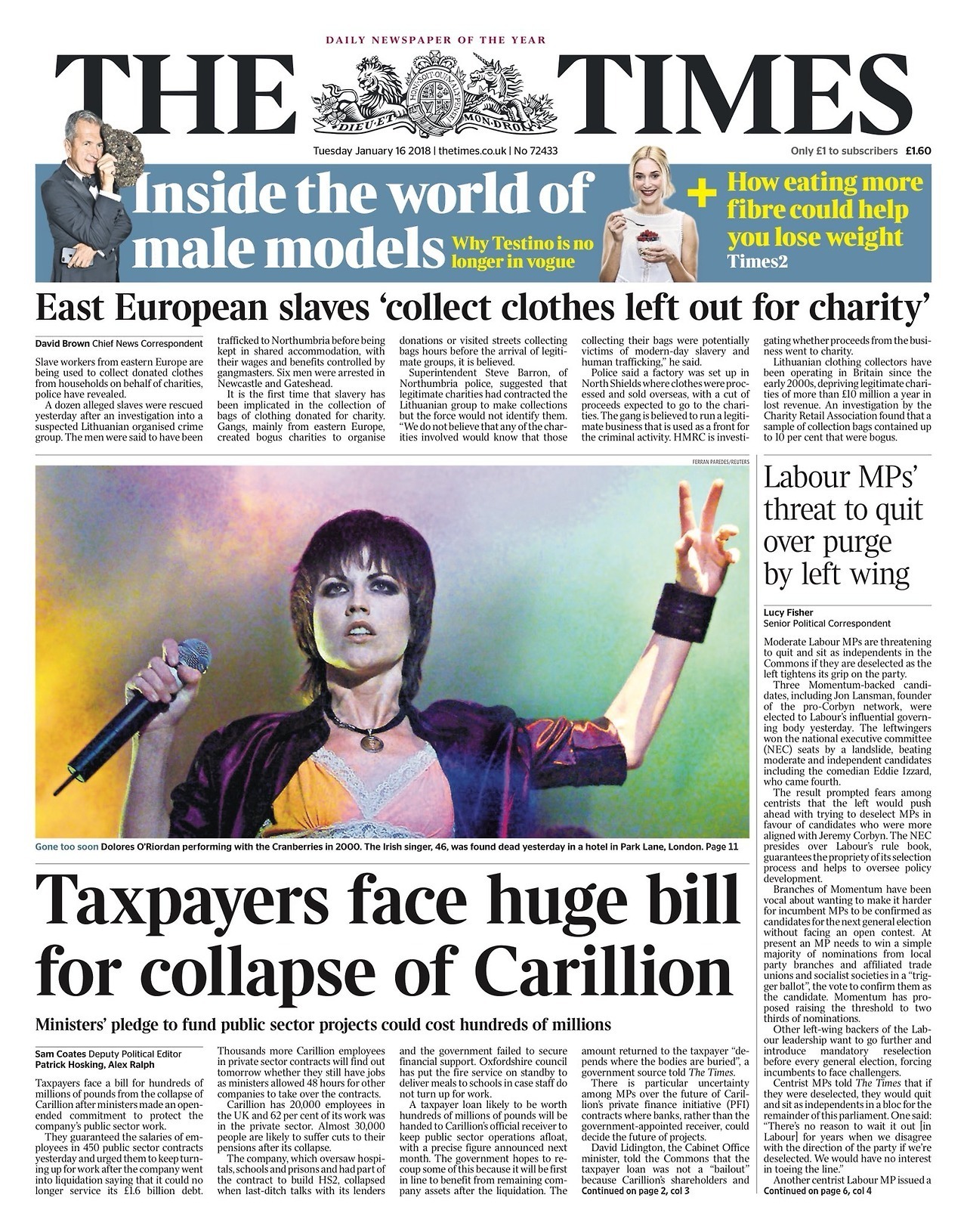 THE TIMES – MARTES 16/1/2018 – Los contribuyentes enfrentan una inmensa cuenta por pagar por el colapso de Carillion: la promesa de los ministros de otorgar fondos a proyectos del sector pĆŗblico podrĆ­a costar cientos de millones – Esclavos de Europa del Este ā€œrecogen ropa usada destinada a caridadā€ – Parlamentarios moderados del Partido Laborista amenazan con renunciar y permanecer como independientes en la cĆ”mara de los Comunes si no se les selecciona, al haber tomado el ala dura izquierdista el control del partido – Se marcha muy pronto: foto de Dolores O’Riordan, vocalista de la banda The Cranberries. La cantante irlandesa de 46 anos ha sido hallada muerta ayer en un hotel de Park Lane, en el centro de Londres
