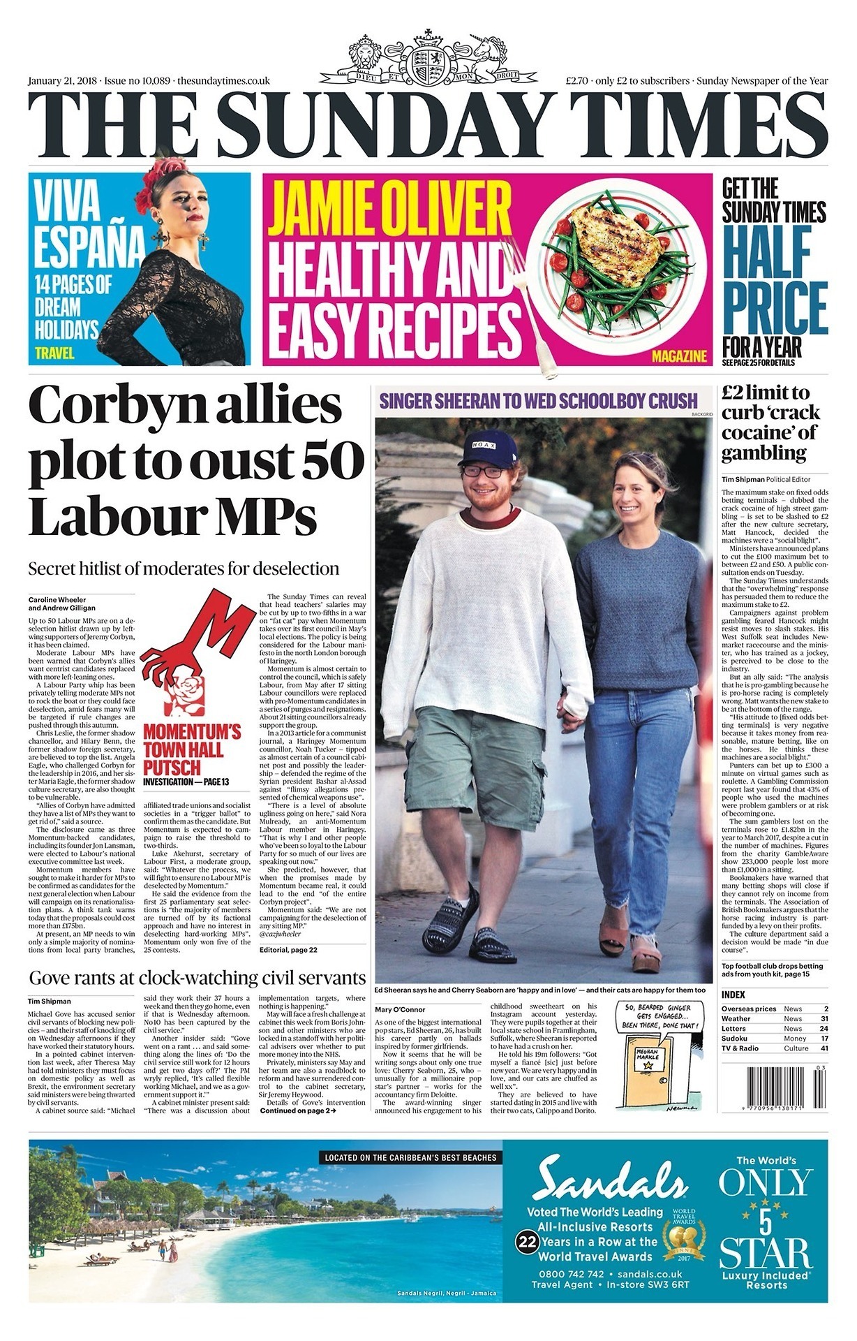 SUNDAY TIMES – DOMINGO 21/1/2018 – Los aliados de Jeremy Corbyn, considerados como el ‘ala dura’ del Partido Laborista, estarĆ­an confeccionando una lista negra con el objetivo de expulsar a 50 parlamentarios moderados de su agrupación, a los que ya se ha amedrentado con la indicación de que ā€œno agiten las aguasā€ bajo riesgo de ser reemplazados por candidatos mĆ”s ā€œa la izquierdaā€ – LĆ­mite de Ā£2 para combatir las apuestas sencillas, conocidas como ā€œla cocaĆ­naā€ de los ludópatas – El ministro Michael Gove ha hecho duras crĆ­ticas a los funcionarios que ā€œmiran la horaā€ y abandonan su puesto de trabajo al cumplir sus 37 horas semanales de trabajo, abandonĆ”ndolo ā€œaunque sea dĆ­a miĆ©rcolesā€ – El cantante Ed Sheeran ha anunciado su compromiso con su amor de adolescencia Cherry Seaborn, contable de la firma Deloitte