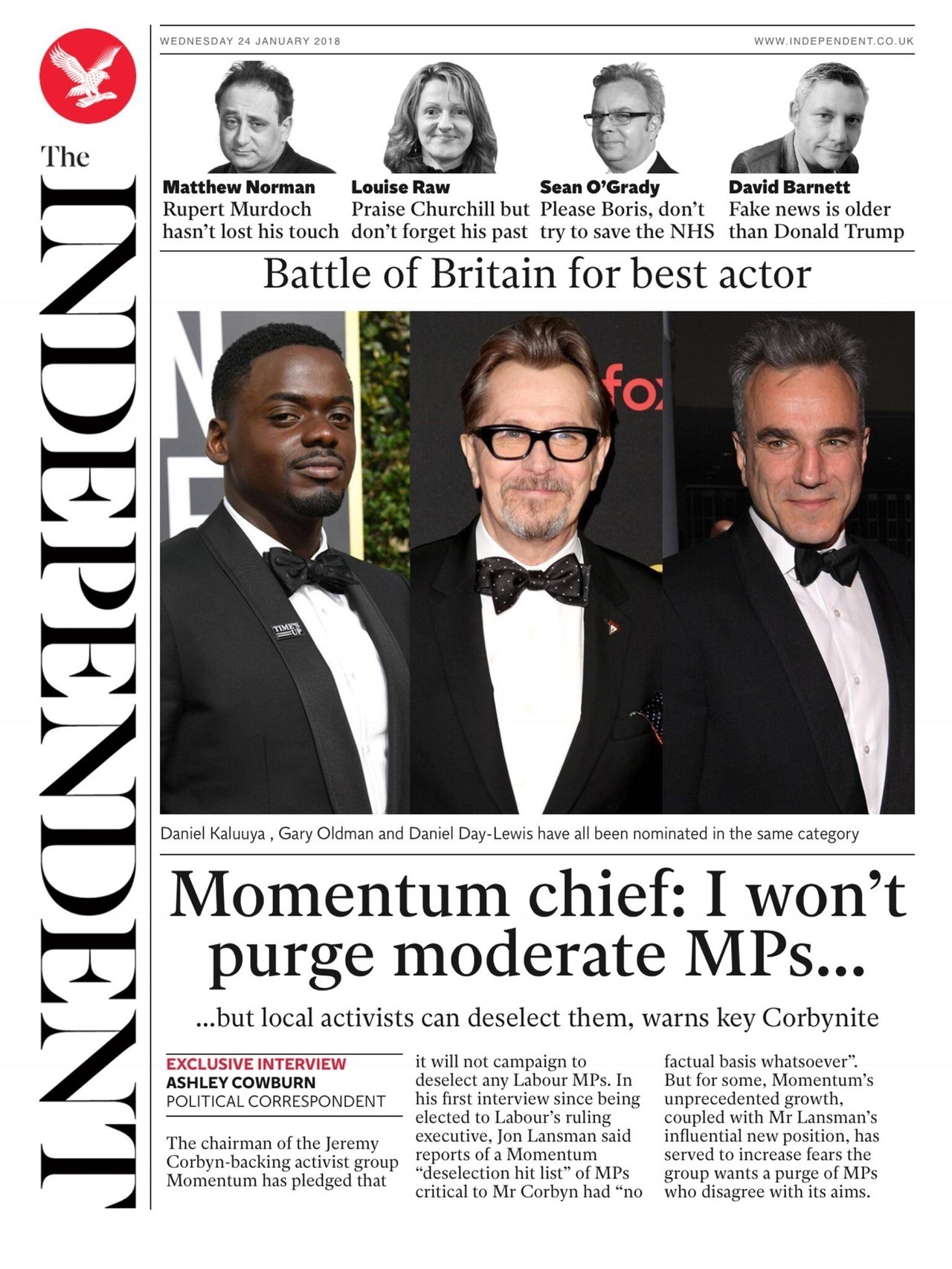 THE INDEPENDENT – MIƉRCOLES 24/1/2018 – Jon Lansman, jefe del grupo activista Momentum que respalda a Jeremy Corbyn, ha prometido que no harĆ” campaƱa para destituir a ningĆŗn parlamentario del Partido Laborista… pero los activistas sĆ­ pueden hacerlo – Ā Batalla de Inglaterra para el mejor actor: los britĆ”nicos Daniel Kaluuya, Gary Oldman y Daniel Day-Lewis, todos nominados en la misma categorĆ­a