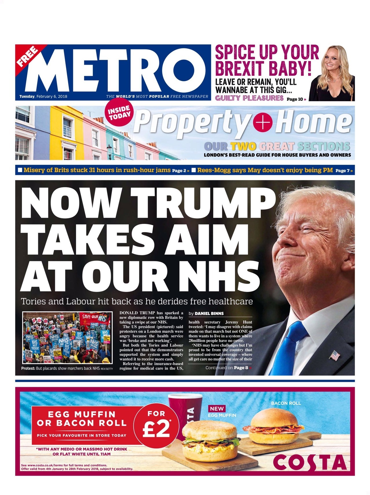 METRO – MARTES 6/02/2018 – Donald Trump ha iniciado un nuevo conflicto diplomĆ”tico con Reino Unido refiriĆ©ndose duramente a nuestro NHS. El presidente norteamericano ha dicho que la gente en Londres ha salido a marchar porque el sistema de salud ā€œestĆ” quebrado y no funcionaā€, mientras el Partido Laborista y el Partido Conservador han aclarado que los manifestantes marchaban para apoyarlo y para que reciba mĆ”s fondos – Emma Bunton, la popularĀ ā€œBaby Spiceā€, ha dado mĆ”s detalles sobre la reunión que las integrantes tuvieron la semana pasada
