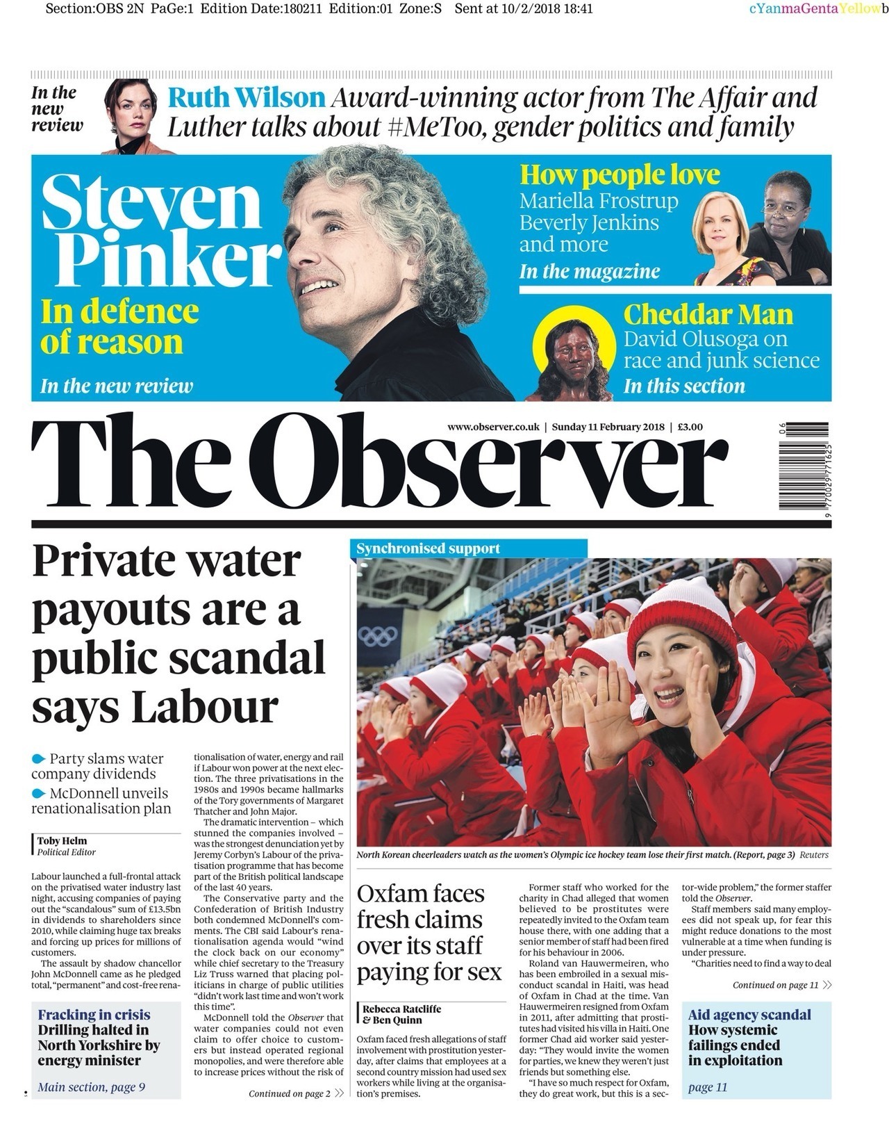 THE OBSERVER – DOMINGO 11/02/2018 – El Partido Laborista ha lanzado un ataque frontal a la privatizada industria del agua anoche, acusando a las compaƱƭas de pagar la ā€œescandalosaā€ suma de Ā£13,500 millones en dividendos a sus accionistas desde 2010, y de reclamar cuantiosas excepciones tributarias forzando la subida de precios a millones de clientes al mismo tiempo – Oxfam ha recibido nuevas acusaciones a su personal jerĆ”rquico de estar involucrado en prostitución, luego de denuncias por las que sus delegados en un segundo paĆ­s extranjero, Chad, tambien habrĆ­an hecho uso de trabajadoras sexuales mientras se encontraban en los edificios de la organización – Apoyo sincronizado: foto de las animadoras observando al equipo olĆ­mpico norcoreano de hockey sobre hielo, que ha perdido su primer partido