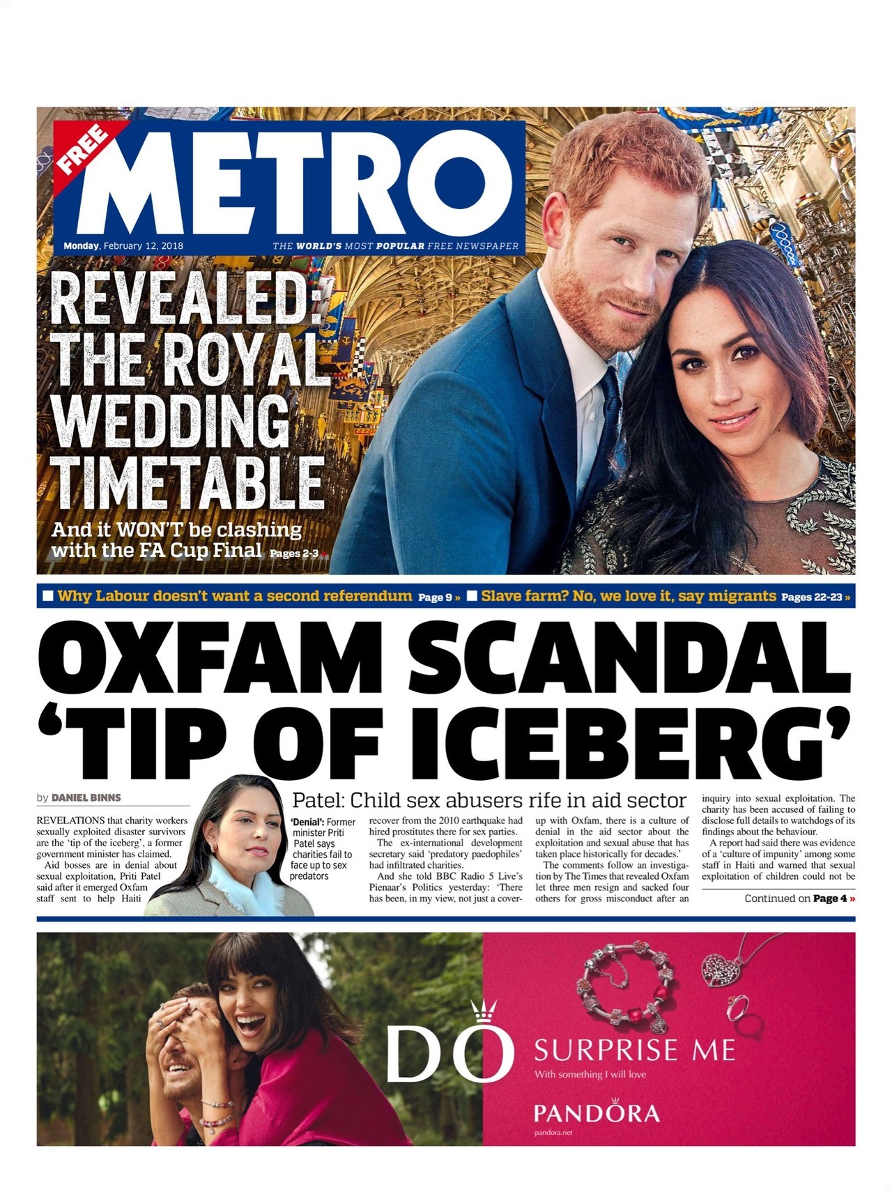 METRO – LUNES 12/02/2018 – El escĆ”ndalo de Oxfam, por el que trabajadores de entidades de caridad habrĆ­an explotado sexualmente a mujeres de las poblaciones que se habĆ­an comprometido a asistir, es soloĀ ā€œla punta del icebergā€ segĆŗn la exministra de desarrollo internacional Priti Patel (foto), para quien los altos ejecutivos de las entidades en cuestiónĀ ā€œse mantienen en negaciónā€ de los hechos, con lo cual los abusadores sexuales actĆŗan a sus anchas en el sector de la cooperación – Revelan el cronograma de la boda real (foto superior) que no se cruzarĆ” con la final de la FA Cup – PorquĆ© el laborismo no quiere un segundo referĆ©ndum – ā€œĀæGranja de esclavos? Nada nada, Ā”nos encanta!ā€ dicen los inmigrantes