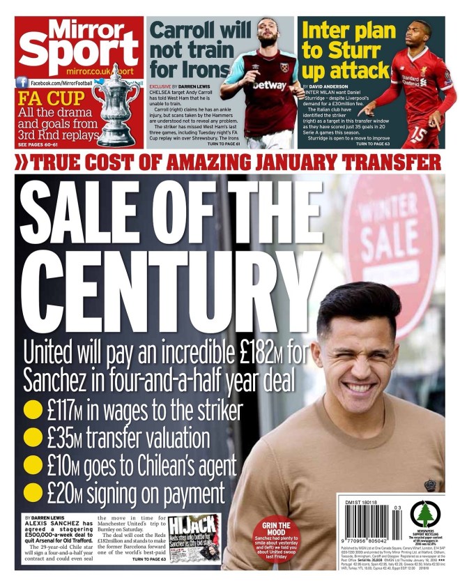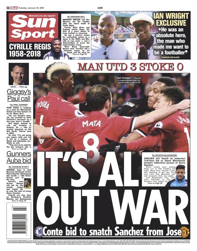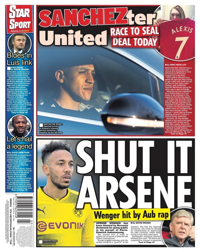 STAR SPORT – VIERNES 19/1/2018 – “Sánchezter” United: el equipo de José Mourinho, corriendo contra el reloj para obtener la firma y el registro del jugador chileno a tiempo para el viaje que los “reds” harán mañana a Burnley por la Premier League, mientras la tienda de la marca auspiciadora ya vende las camisetas con el 7 de Sánchez en su tienda de Londres – “Cállate, Arsene”: la directiva del Borussia Dortmund considera una falta de respeto que el técnico francés opine sobre el traspaso de su jugador Pierre-Emerick Aubameyang, y que “debería concentrarse en dar alegrías a su equipo” – Luis Enrique, extécnico del FC Barcelona, sería el sucesor de Antonio Conte en el Chelsea FC – Presionan a las ligas de fútbol inglesas para homenajear al fallecido Cyrille Regis en los partidos de este fin de semana