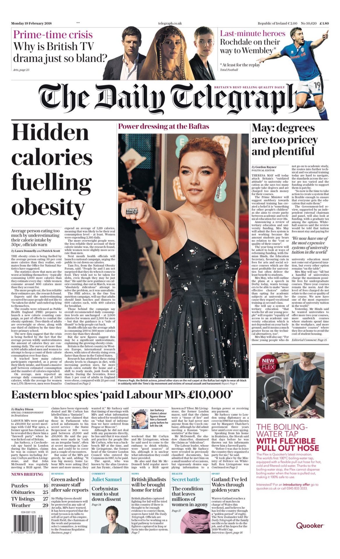 DAILY TELEGRAPH – LUNES 19/02/2018 – La crisis de la obesidad va en aumento porque la persona promedio come 50% más calorías de las que cree, según estimados de la oficina nacional de estadística (ONS) por los cuales los hombres son quienes más se engañan, consumiendo hasta 1000 calorías más de lo que les parece que han ingerido – Los espías del antiguo bloque soviético “pagaron hasta £10.000″ a los parlamentarios laboristas británicos por encontrarse con ellos, quienes incluso habrían pagado al exagente Jan Sarkocy con una “fiesta de despedida” cuando terminó su misión – Theresa May dice que los grados académicos “son muchos y demasiado caros” – Foto de la actriz Florence Pugh en la ceremonia de premiación de los BAFTA 2018, vestida de negro en solidaridad con el movimiento #TimesUp