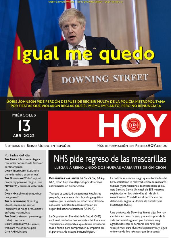 The Times – Johnson se niega a renunciar por multa de fiesta en confinamiento Daily Telegraph – ‘El pueblo tiene derecho a esperar más’ The Guardian – PM: Infringí mi propia ley pero me niego a irme Metro – PM y canciller violaron la ley Daily Mail – ¿No saben que hay una guerra? The Independent – Downing Street, escena del crimen i news – PM se niega a renunciar y enfrenta más multas The Sun – Lo siento… pero tengo trabajo que hacer Daily Express – PM: Lo siento, trabajaré mejor por el país City AM – Multados Daily Mirror – Gobernados por mentirosos