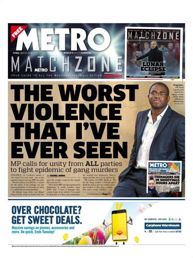 Lammy pidió la unidad de todas las partes para luchar contra la epidemia de asesinatos de pandillas y afirmó que un “mercado de drogas de £11.000 millones” ha llevado a las pandillas a guerras territoriales, y agregó que “somos el mercado de drogas de Europa y creo que la policía y nuestro país han perdido el control sobre ese mercado. Incluso niños pequeños – de tan solo 12 o 13 años – son reclutados en pandillas para trasladar drogas a través de los límites distritales.” Dijo que a pesar de las cuatro muertes en Haringey, no ha recibido ni una llamada telefónica de la ministra del interior, Amber Rudd, ni del alcalde de Londres, Sadiq Khan.