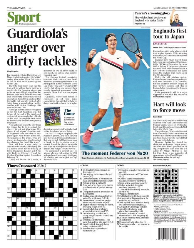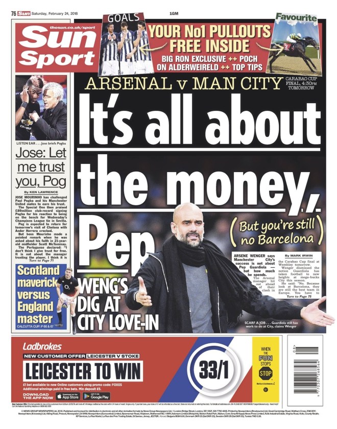 SUN SPORT – SÁBADO 24/02/2018 – Arsene Wenger lanza la primera piedra y dice que el éxito del Manchester City se basa en el gasto desmesurado en jugadores, no en la genialidad de Pep Guardiola: “El Barcelona es todavía el mejor equipo de Europa. El fútbol ha cambiado y los mejores jugadores fichan por unos cuantos clubes: como entrenadores, quizá podamos impartir un poco de nuestra filosofía a nuestros equipos pero este deporte ahora pertenece a los jugadores, su importancia es mayor que nunca” – José Mourinho ha retado a Paul Pogba para que se gane su confianza después de la discusión que tuvieron en el camarín del Manchester United, diciendo que no le da su confianza a nadie gratis, que “no se trata de que el entrenador confíe en el jugador, creo que corresponde al jugador hacer que el entrenador confíe en él”; luego ha elogiado al francés, su fichaje récord de £89 millones, por su reacción a la crítica – La estrella de Inglaterra Chris Robshaw insiste en que Escocia no les asustará con tácticas sucias; los archirrivales se enfrentan en un partido,