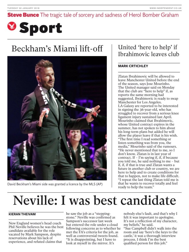 THE INDEPENDENT SPORT – MARTES 30/1/2018 – Phil Neville cree que era “el mejor candidato disponible” para el puesto que dejaba Mark Sampson como seleccionador de fútbol femenino, a pesar de las reservas que se tenía con su falta de experiencia y acusaciones de que veía el rol más como un “escalón de ascenso” – José Mourinho ha dicho que permitirá que Zlatan Ibrahimovich deje el Manchester United antes que termine la temporada – Foto de David Beckham, que ha recibido una licencia de la MLS para abrir un equipo de fútbol en Miami – La trágica historia de brujería y tristeza del problemático boxeador Herol Bomber Graham