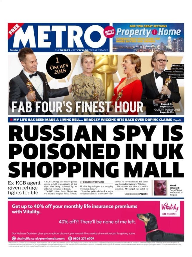 Un ex espía ruso de la KGB que se convirtió en agente secreto del MI6 lucha por su vida en el hospital, después de haber sido aparentemente envenenado: Sergei Skripal, encarcelado en 2006 en Rusia por espiar para Gran Bretaña, colapsó junto a una mujer más joven en el área comercial The Maltings en Salisbury ayer por la tarde