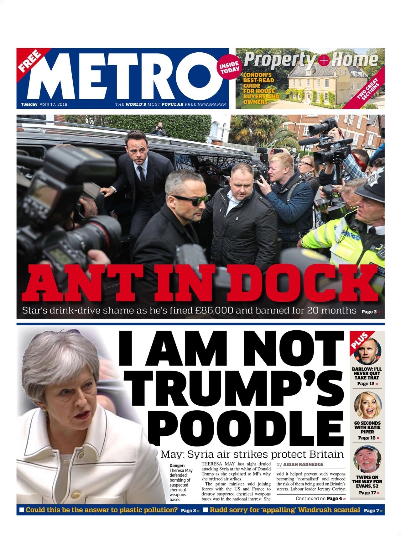 Theresa May negó ayer haber intervenido en Siria por seguir el capricho de Donald Trump, mientras explicaba en el Parlamento porquĆ© ordenó los ataques: la primera ministra dijo que unir fuerzas con Estados Unidos y Francia para destruir presuntas bases de armas quĆ­micas era de interĆ©s nacional, y dijo que con ello se ha contribuido a impedir que tales armas seĀ ā€œnormalicenā€ y que exista el peligro de que sean usadas en las calles de Reino Unido.