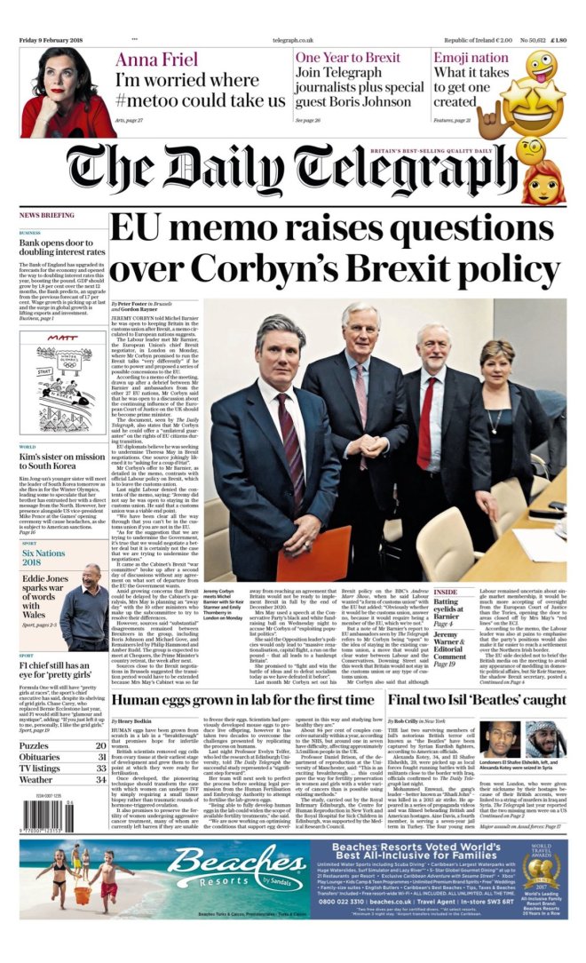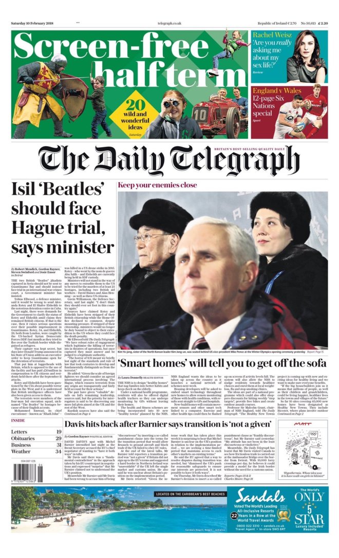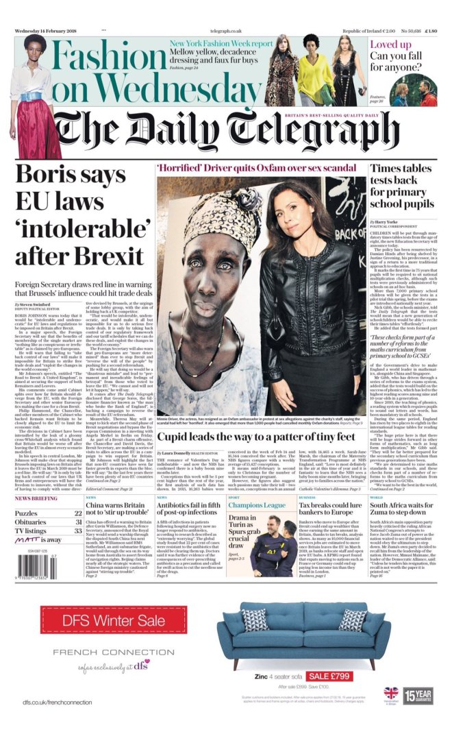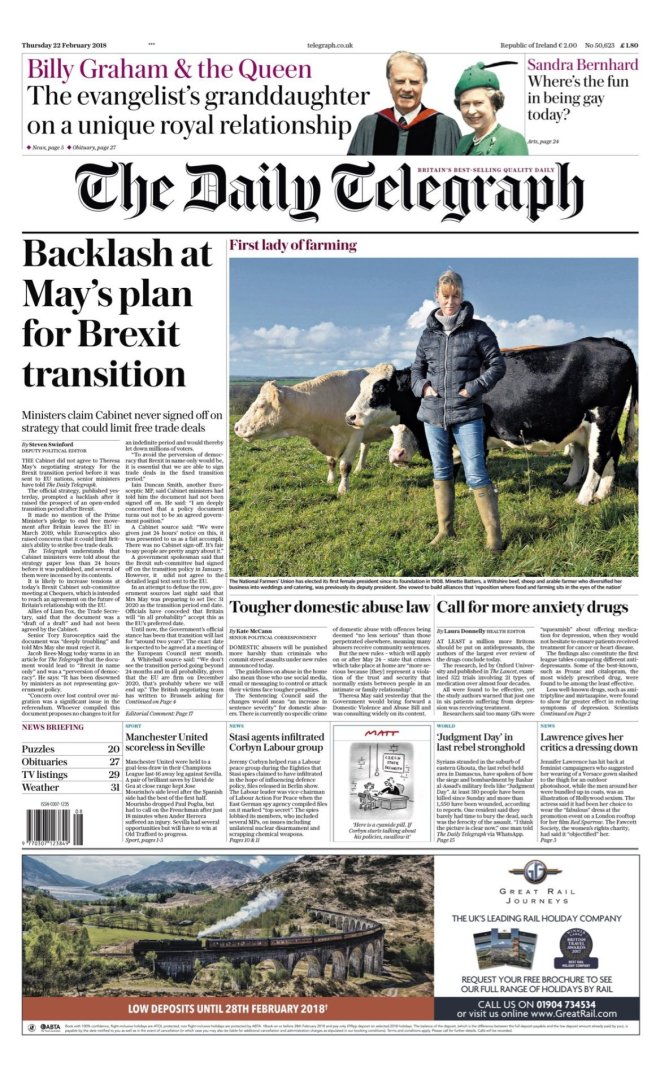 DAILY TELEGRAPH – JUEVES 22/02/2018 – El gabinete nunca estuvo de acuerdo con la estrategia de negociación para el período de transición del Brexit antes de que se enviase al resto de 27 naciones europeas, según han informado varios ministros al diario; la estrategia oficial, publicada ayer, ha provocado rechazo al abrir la posibilidad de un período de transición indefinido luego de la salida británica de la UE – Los culpables de abuso doméstico enfrentarán penas más duras que las del crimen callejero, se ha informado ayer – Al menos 1 millón de británicos más deben tomar antidepresivos, según un estudio de la Universidad de Oxford publicado en The Lancet – La primera dama de las granjas: foto de Minette Batters, ganadera de Wiltshire electa como la presidenta de la Unión Nacional de Ganaderos (NFU), la primera mujer desde la fundación de la entidad en 1908